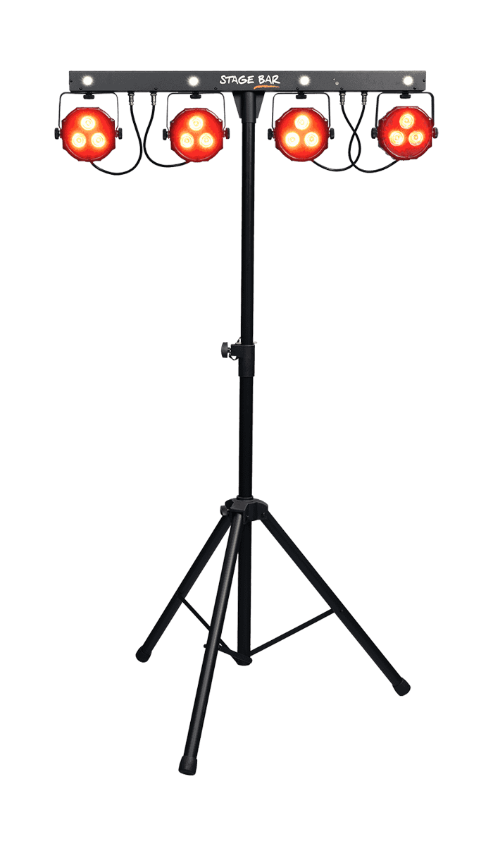 Der Florida Bar hat 2 LED PARs, 2 Derby-Effekt-Projektoren, ist höhenverstellbar und kann dank 4 integrierter, weißer LEDs Stroboskopeffekte hervorrufen.